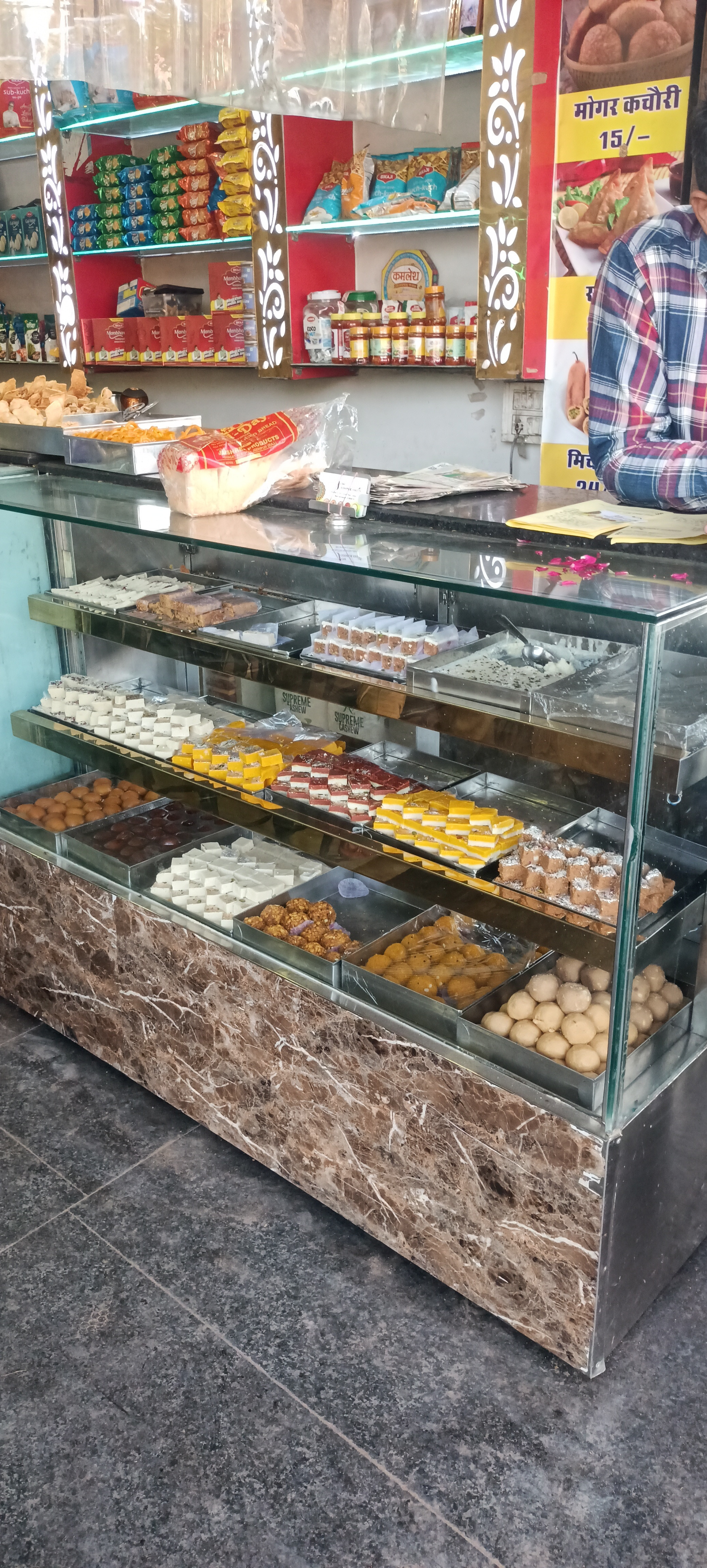 All type marwadi mithai kaju kathli, mawa, barfi,etc . Sweet any time fress milta h